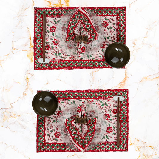 Handblock printed table linen with nature inspired floral and scared geometry motifs,...