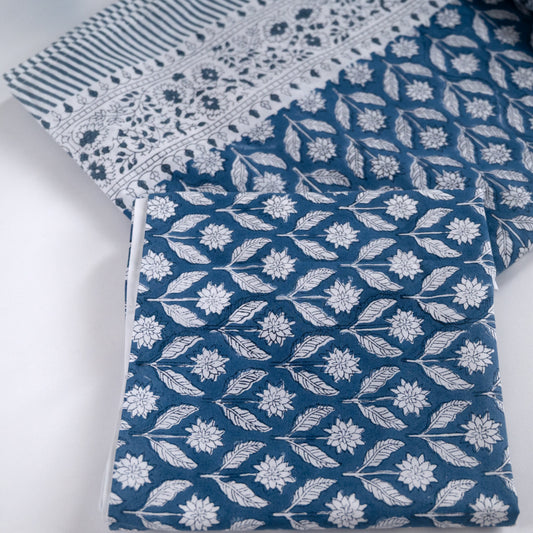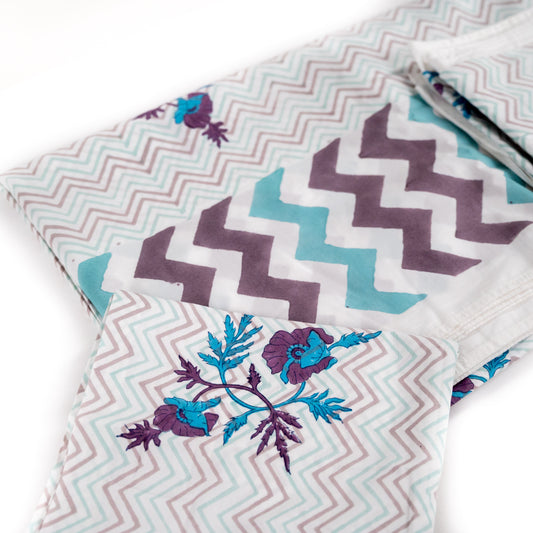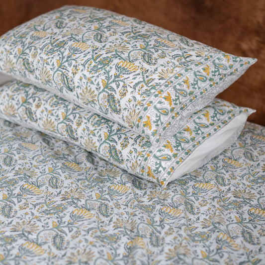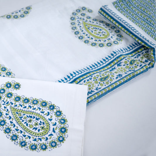 Handblock printed percale cotton bedsheets with matching pillowcases. Soft, luxurious, chemical free bedding sets that is breathable and moisture-wicking all year around.