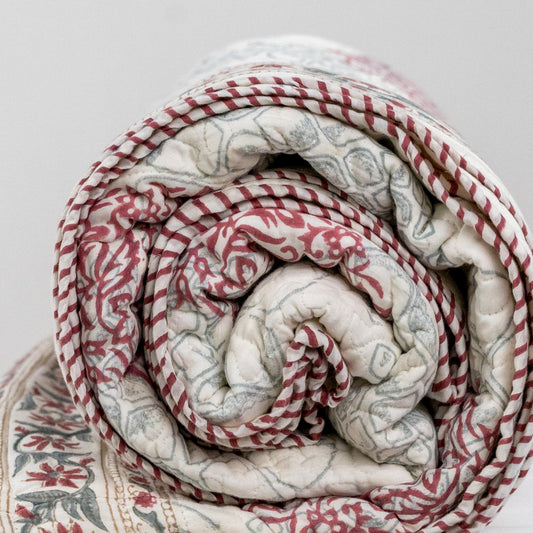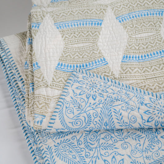 Handblock printed bedspreads, that are lightly quilted and machine washable. Reversible bedspreads with two distinct design looks. These bedspreads are very versatile, they can be used as light blankets and bedspreads