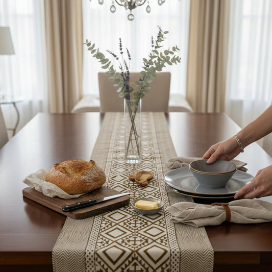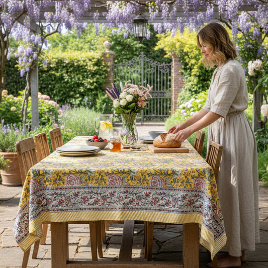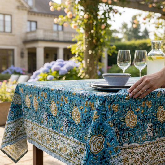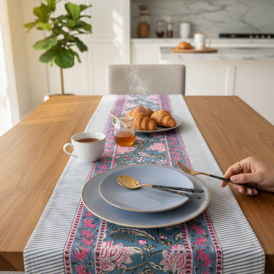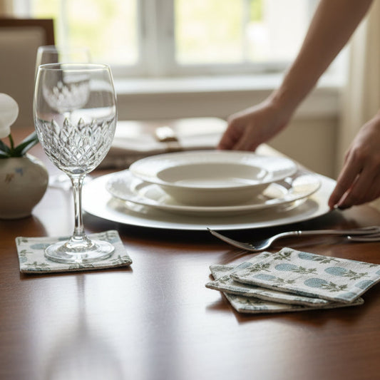 Handblock printed table linen with nature inspired floral and scared geometry motifs, and handcrafted to perfection for adding that extra cheer to your dinning experience.