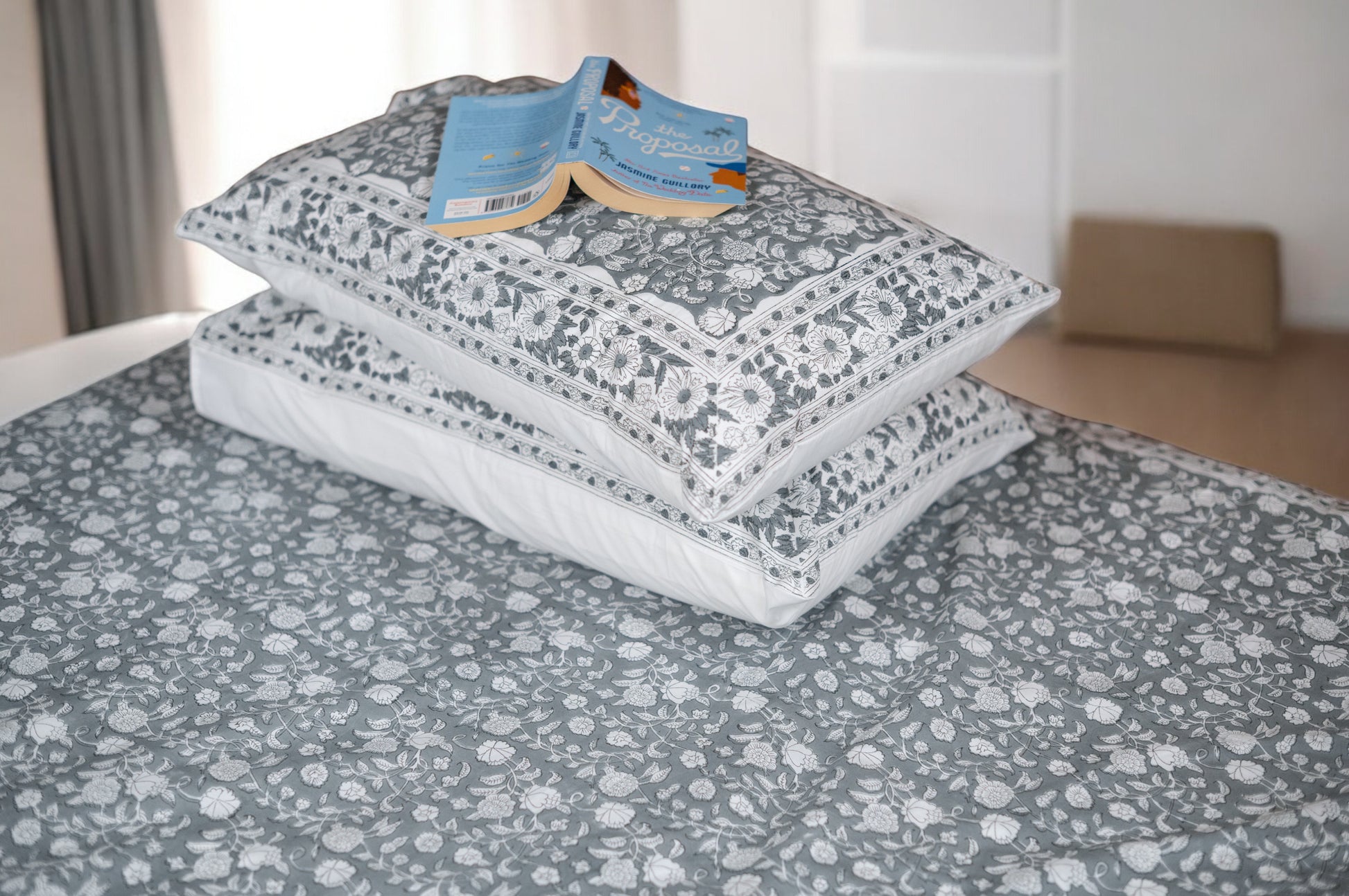 Drawing inspiration from the enchanting sight of flowers gently cascading from trees, this handblock printed bedsheet features a delicate white jasmine motif set against a soft grey background. The serene white on grey palette evokes purity, elegance, and grace, capturing the timeless beauty and feminine qualities associated with jasmine. Traditionally tied to themes of marital harmony and fidelity, jasmine’s gentle presence transforms your bedroom into a tranquil haven, making this design the perfect embodiment of refined simplicity and heartfelt serenity.