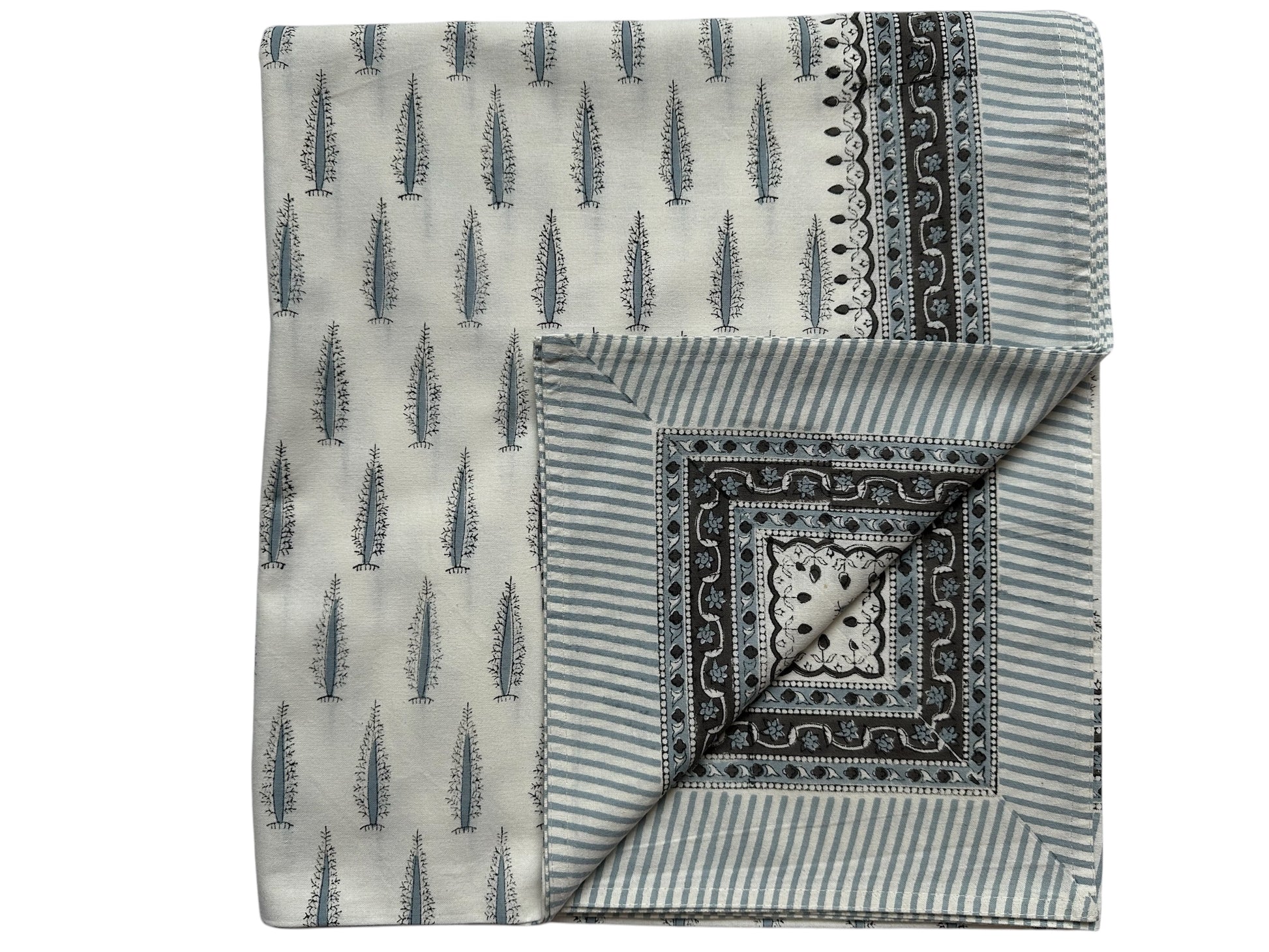 Drawing inspiration from the thistle flower, this handblock printed tablecloth features delicate motifs in soothing blue and grey hues set against a crisp white. The design beautifully embodies the thistle’s symbolism of inner beauty and resilience, with gentle blooms at the core juxtaposed with subtle, spiky accents. Evoking a sense of happiness and warmth, these artistic elements come together to create a refined, festive atmosphere—perfect for celebrating special gatherings in elegant style.