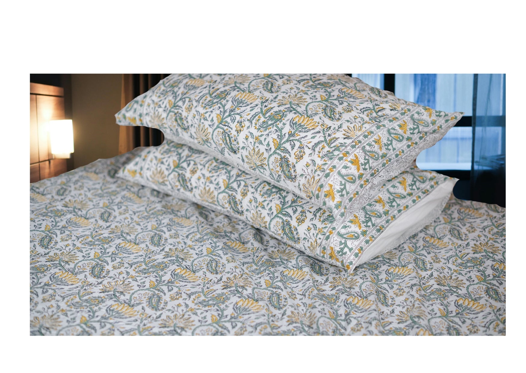 Inspired by the radiant beauty of marigold flowers, this handblock printed bedsheet showcases vibrant yellow petals framed by subtle green leaves. The marigold motif is thoughtfully chosen for its rich symbolism, representing joy, energy, good luck, and creativity. This design infuses your bedroom with warmth, passion, and a sense of prosperity, making it a lively addition to your home or a heartfelt gift that celebrates positivity and excitement.