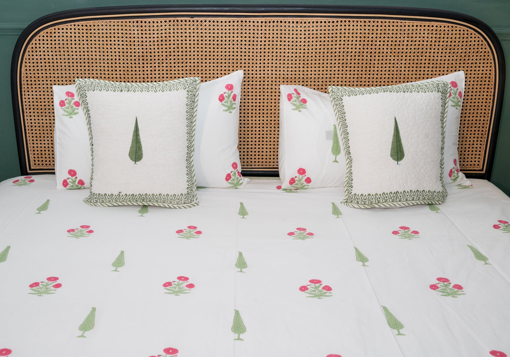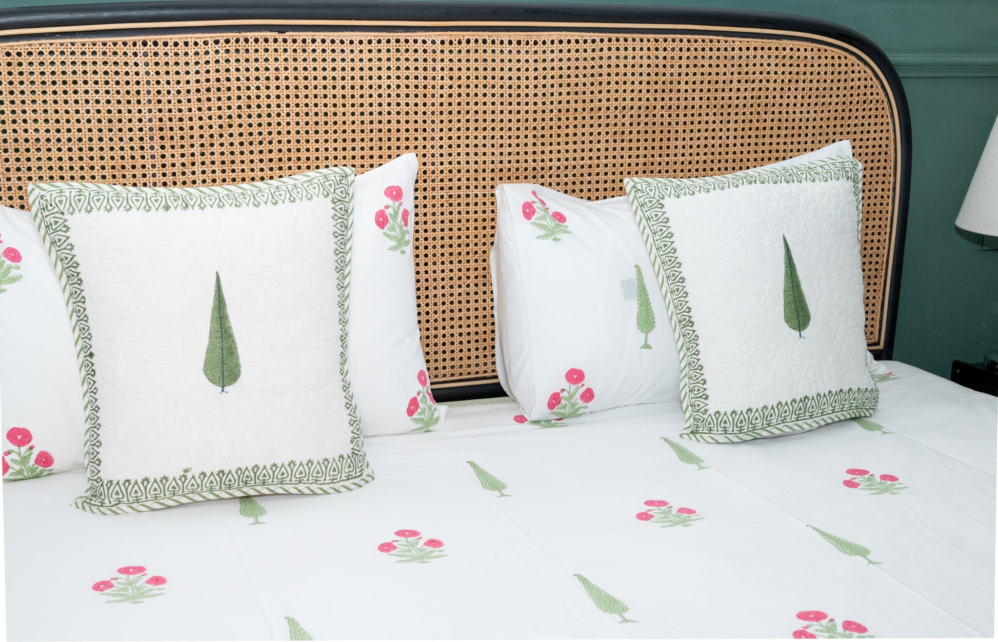 Inspired by the timeless artistry of handblock printing, this motif design draws from the enchanting beauty of lush green leaves paired with vibrant red flowers. The delicate red blossoms evoke love and affection, while the green leaves represent renewal, hope, and growth. Together, these elements create a harmonious pattern that celebrates protection and grace: reminiscent traditional floral motifs in Mughal architecture. This hand block printed bedsheet design transforms any space into a tranquil retreat, radiating warmth, vitality, and the enduring allure of nature’s elegance.